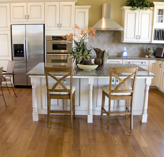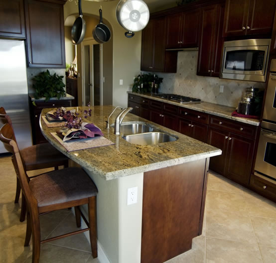 This maple framed kitchen done in traditional style with concealed hinges. It has a Mocha Ginger spray stain, 525-0428, on RS 1101 doors and slab drawer fronts. It also features granite countertops and granite backsplashes.