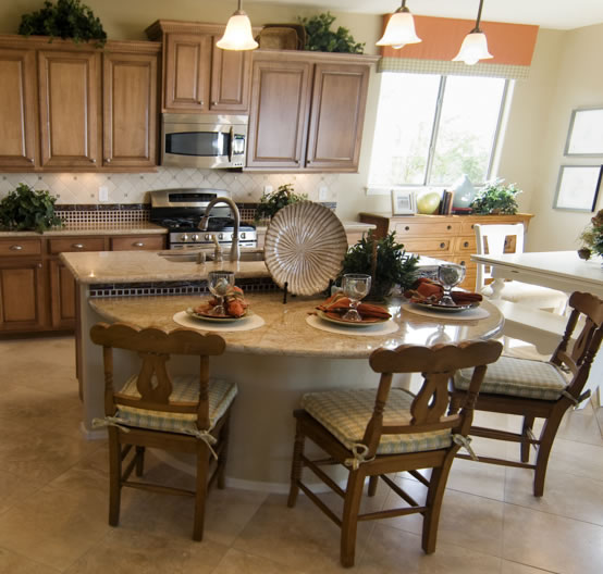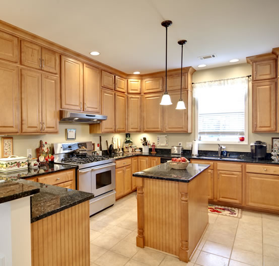 This kitchen features a Sienna spray stain, 525-1280, on maple doors. The Crown Mould was a rope moulding. The maple doors were an RS mitred door with a 8201 style and a bead outside profile. Countertops are granite.