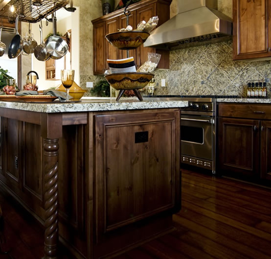 This frameless kitchen features a knotty alder kitchen with a K&L Bernardino spray stain, 525-2216. The RS door style is MD3501-AP, (mitred, reverse solid panel with applied moulding) with a 3/8" round outside profile. The countertop is Cambria Quartz.