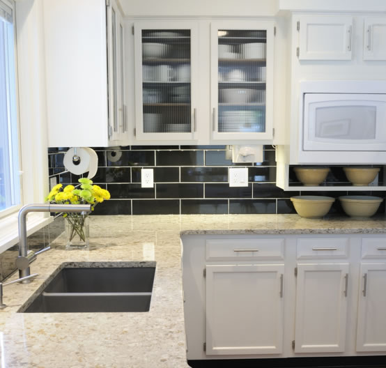 This framed kitchen features a smooth white colored lacquer. The cabinet style is traditional with 1/2" overlay. The glass doors have Spectrum Quarter Reed inserted into an open frame. Liberty bar pulls and Quartz tops.