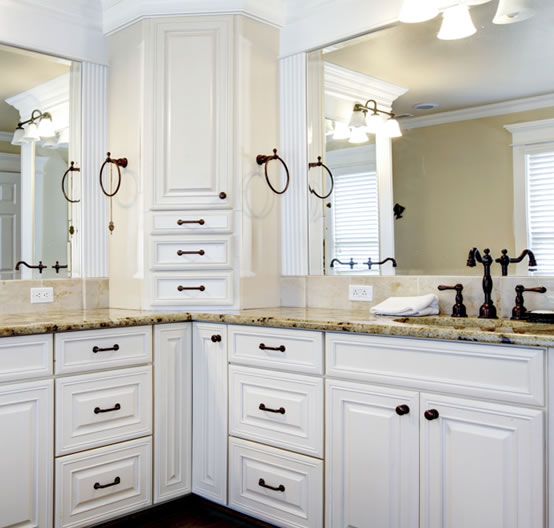 This frameless vanity features a white colored lacquer on Caron doors with a style of 1200, a central panel of 510 and an outside profile of P04. The countertops are granite. The pulls and knobs are Amerock.